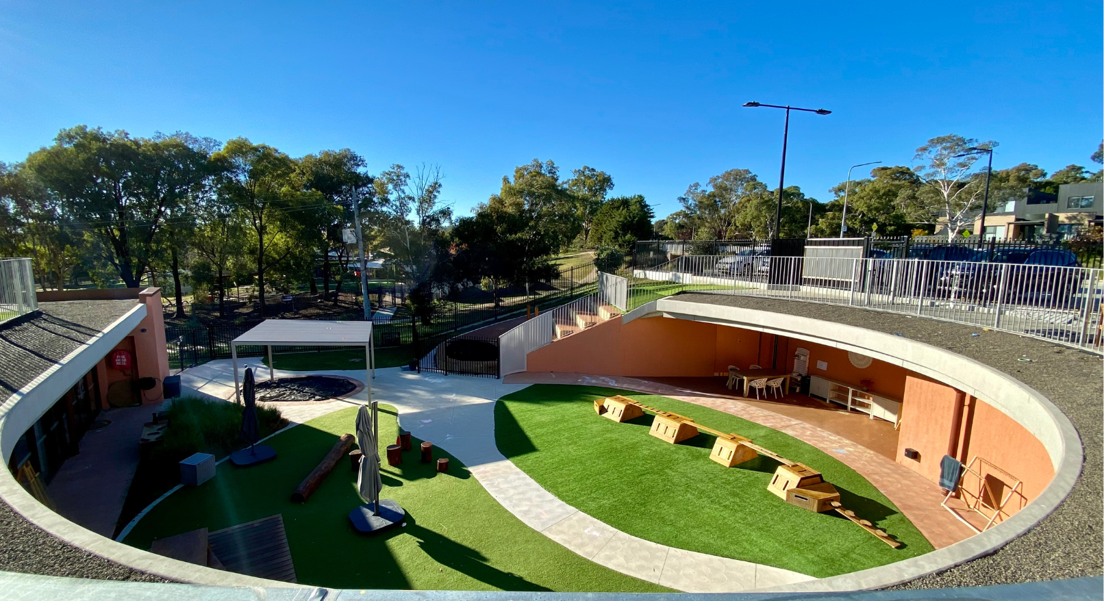 The outdoor spaces are zoned to respond to different age groups while maintaining a unified design language. Dedicated areas for babies are located on the upper level, providing a secure and controlled environment tailored to their developmental needs, while still allowing connection to the broader centre.