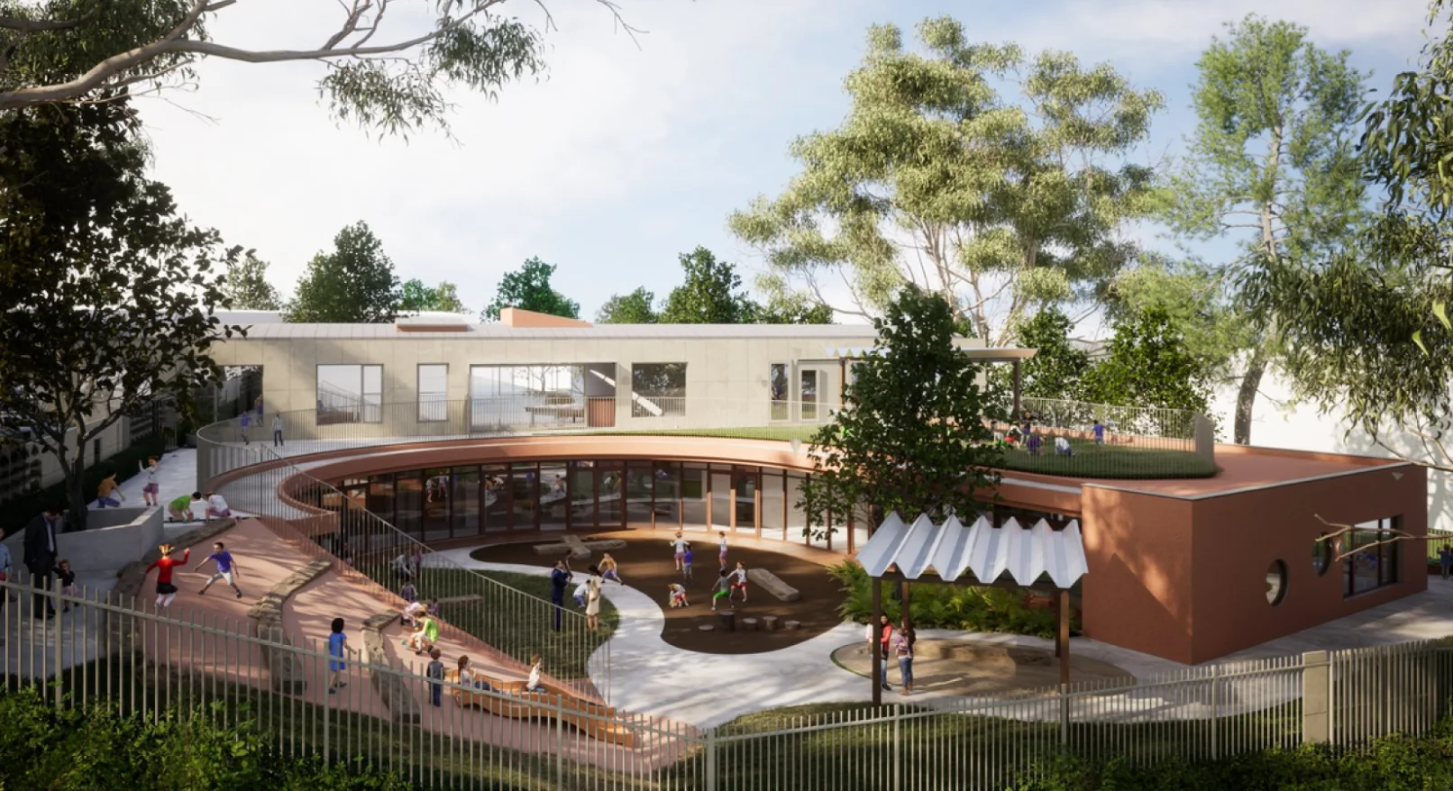 From there, the concept of community was developed through the landscape itself. The ground plane is folded up and around the building, creating a protective, embracing form that connects the lower and upper levels. This move allowed the project to work naturally across the steep site—establishing a more public interface at the upper level, aligned with the street and shops, while strengthening connections at the lower level to the adjacent primary school. The circular planning also enables playrooms to face one another, encouraging interaction and a shared sense of belonging.